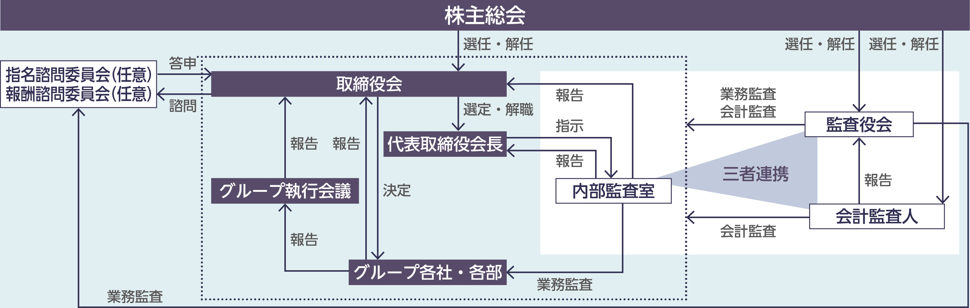 | 監査役会 | 各監査役は、株主総会及び取締役会のほか、経営会議等の重要な会議への出席、ならびに取締役、従業員及び会計監査人からの報告の収受等を通じて、取締役の職務執行を監査・監督しております。 | 監査役3名で構成 (うち社外監査役2名) |